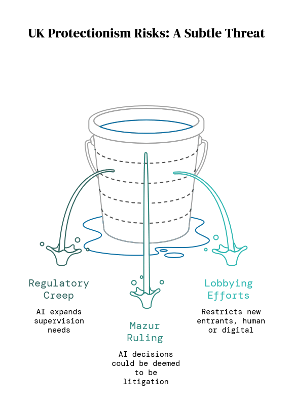 Third, professional body lobbying: there is always debate within the profession for bringing new entrants (whether human or digital) within the regulatory franework, often framed as consumer protection but functioning as market restriction.